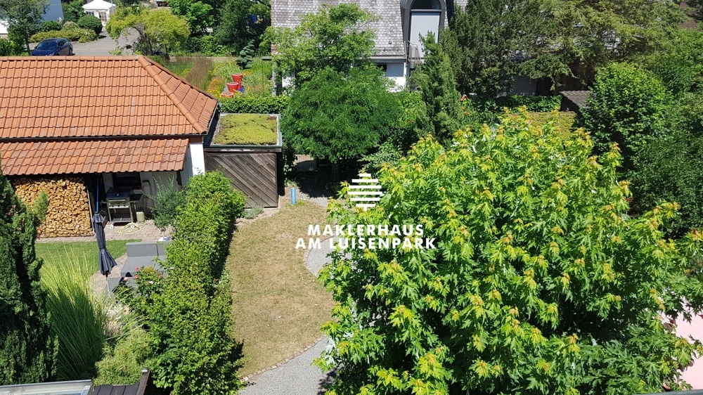 Der Garten befindet sich in Ost-Westausrichtung. Er ist schön eingewachsen mit schattenspendenden Bäumen und Sträuchern. Außerdem gibt es hier ein sehr gepflegtes Gartenhäuschen.