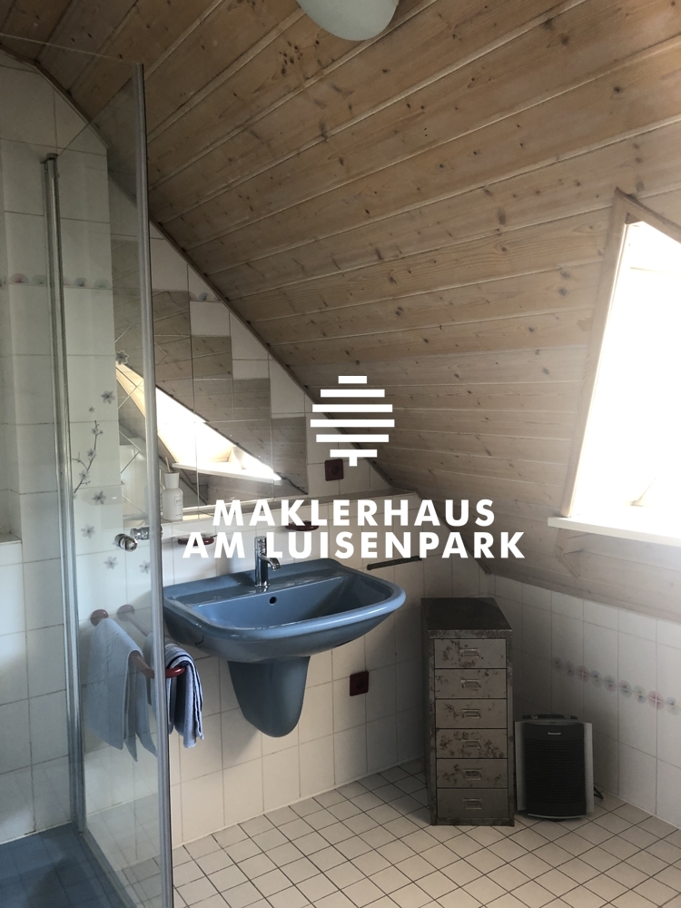 Das Treppenhaus aus Esche wurde weiß gebeizt. Im Obergeschoss wurden teilweise neue Fußböden verlegt und auch die Decken teilweise getauscht. In den Badezimmern wurden die Armaturen getauscht und im Duschbad im Obergeschoss eine neue Duschkabine installiert. Alle Fliesen im gesamten Haus sind von Villeroy & Boch, alle Armaturen sind von Hans Grohe. Das Obergeschoss verfügt über drei Zimmer, das Dachgeschoss verfügt über zwei Zimmer.
