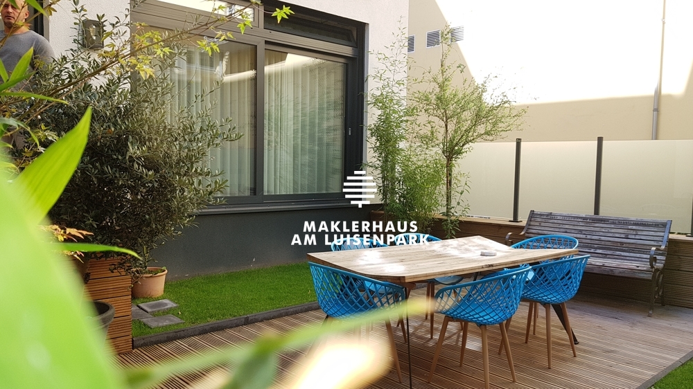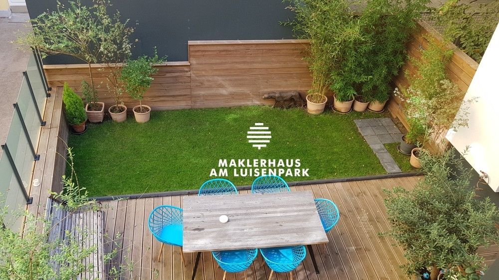 Die Terrasse in Nord-West-Ausrichtung wurde mit Holzdielen ausgelegt. Der Garten ist ca. 53 m² groß.