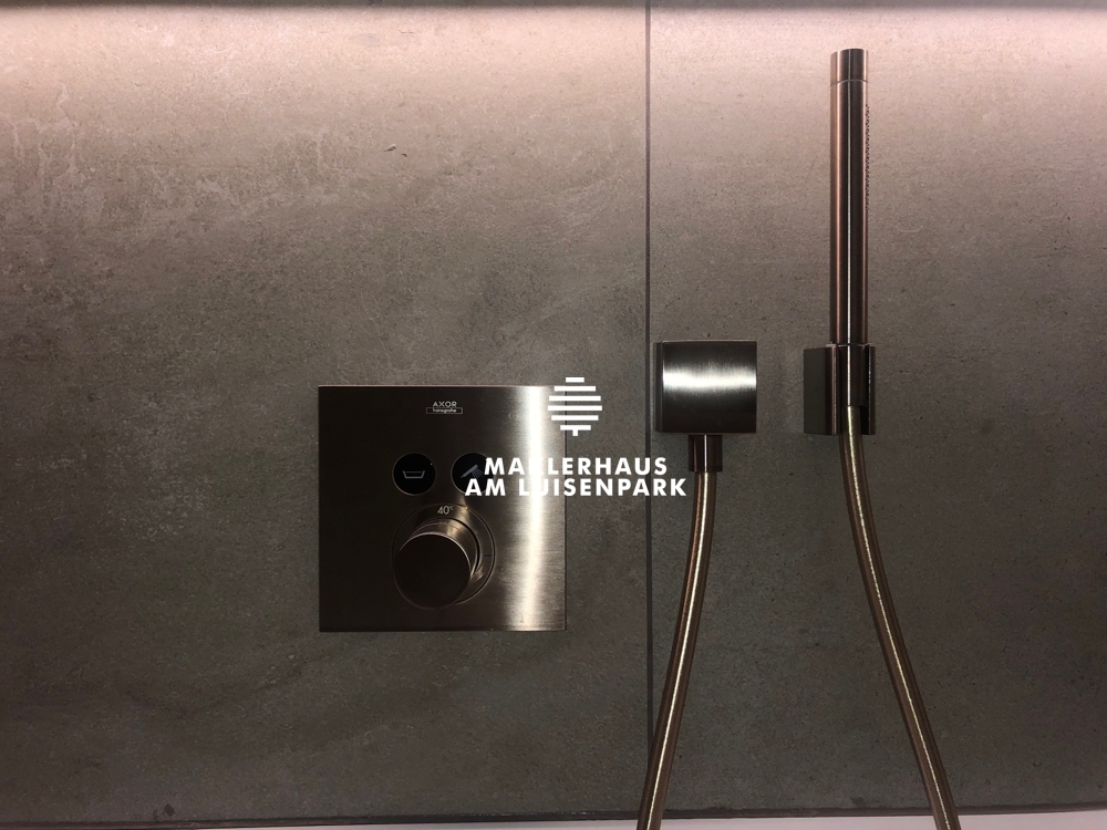 Die modernen Badezimmer sind mit extra großen Feinsteinfliesen ausgestattet. Die Amaturen in allen Bädern wurden von der Firma Grohe in Rostbraun sonderangefertigt.