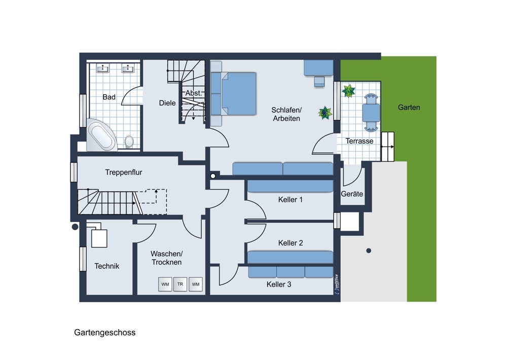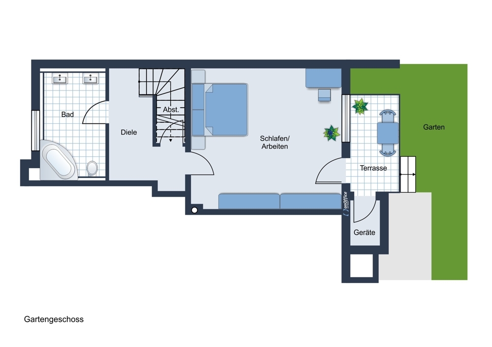 Über einen Treppenabgang in der Diele des Erdgeschosses gelangen Sie in das Gartengeschoß. Dieses verfügt über ca. 44 qm, die sich in ein Tageslicht-Bad mit Wanne/WC, einen Flur, einen kleinen Abstellraum und eine großes helles Zimmer mit Ausgang zu einer weiteren Terrasse und zum Garten unterteilen.
