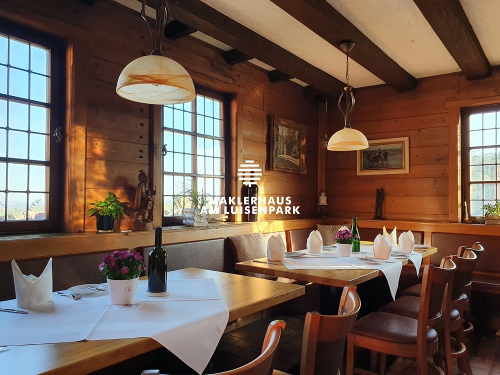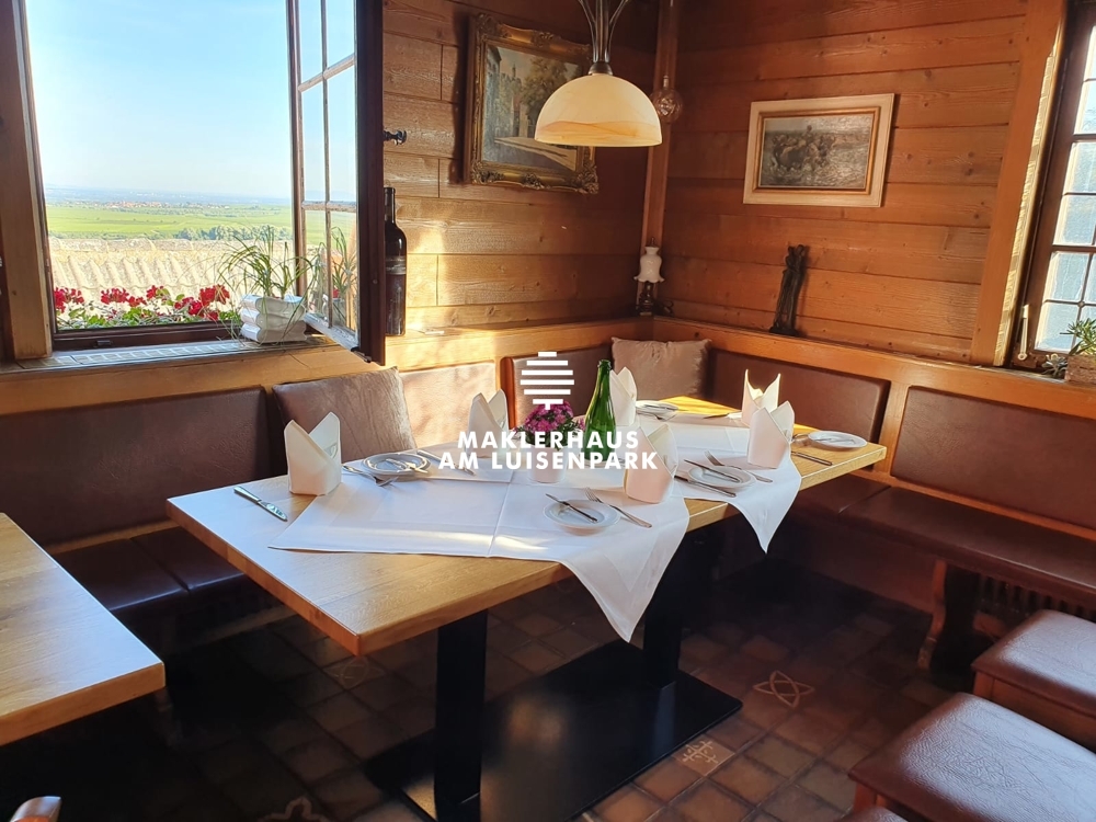 Das Restaurant befindet sich im 2.Obergeschoss. Von hier aus kann man bei Tisch den herrlichen Fernblick weit über die Rheinebene bis hin zum Odenwald genießen.