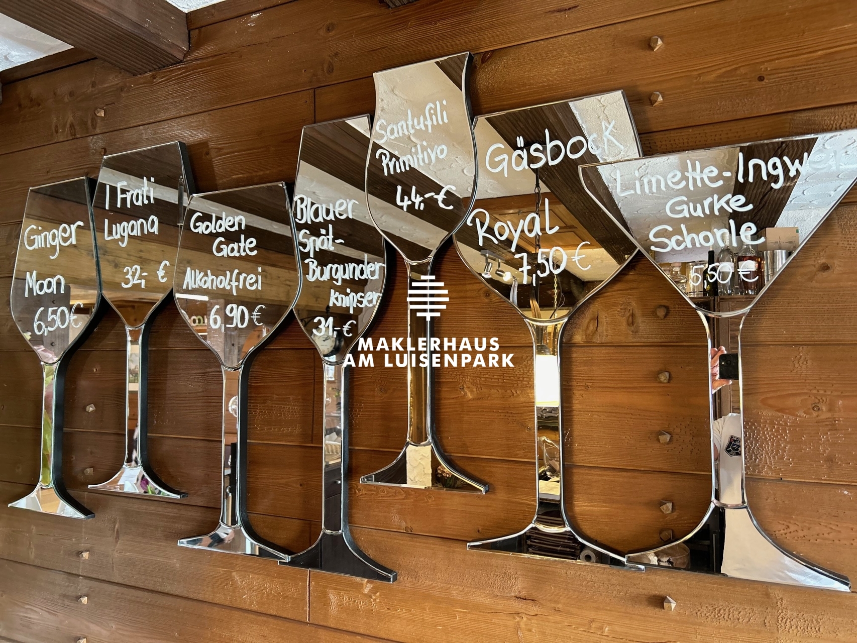Trinkgläser sind ebenfalls in ausreichender Zahl vorhanden sowie ca. 18 neuwertige Speisekarten mit festem Einband und Holzrahmen.