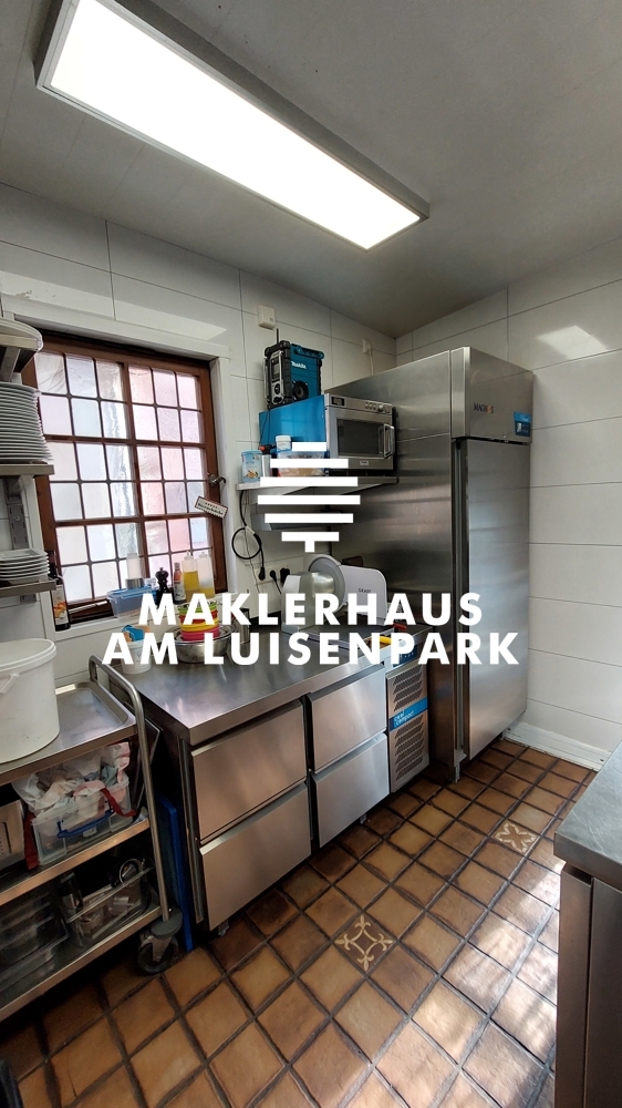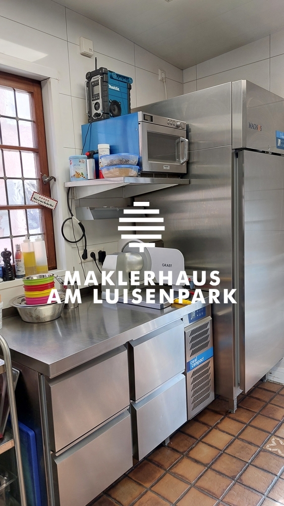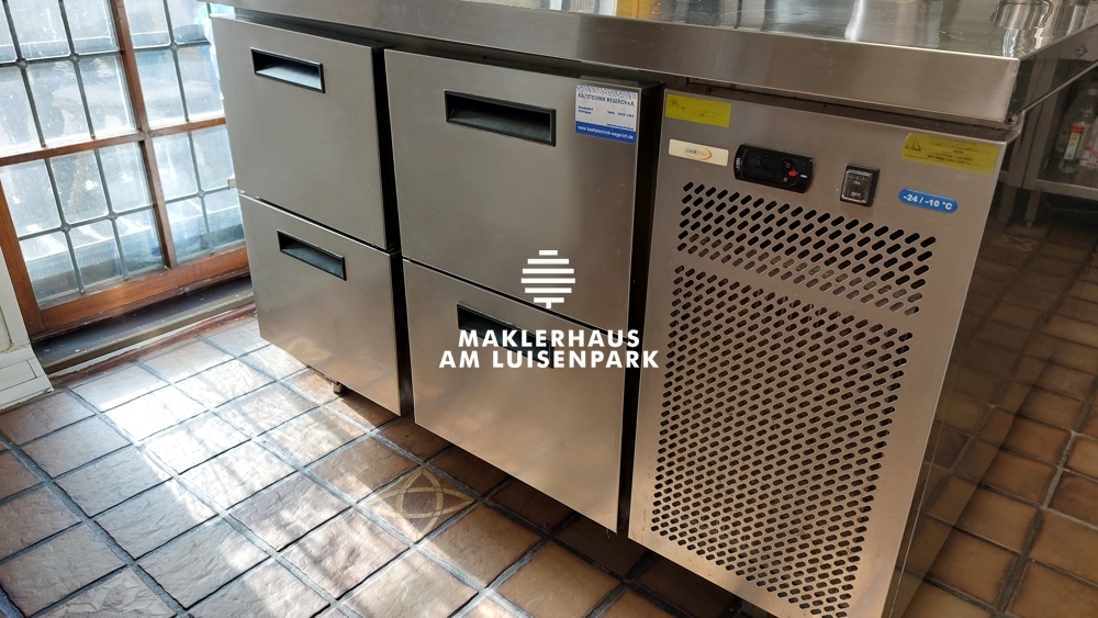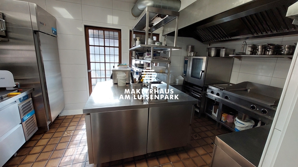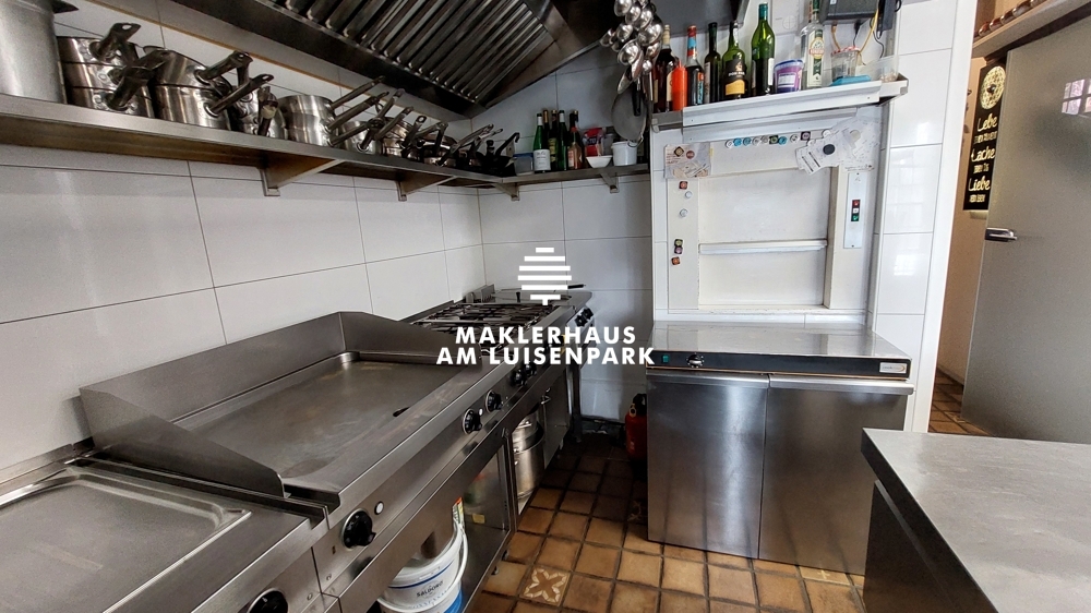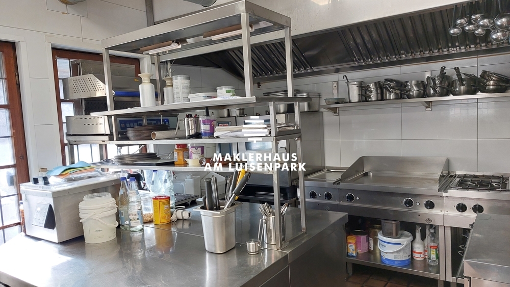 Die vollausgestattete Küche befindet sich im 1.OG. Im Jahr 2019 wurde die Küche komplett entkernt und mit hochwertigen Gastromöbeln von der Firma LACHER Großküchen GmbH eingerichtet. Mit einem vorhandenen Speiseaufzug werden die Speisen von der Küche zum Gastraum befördert.