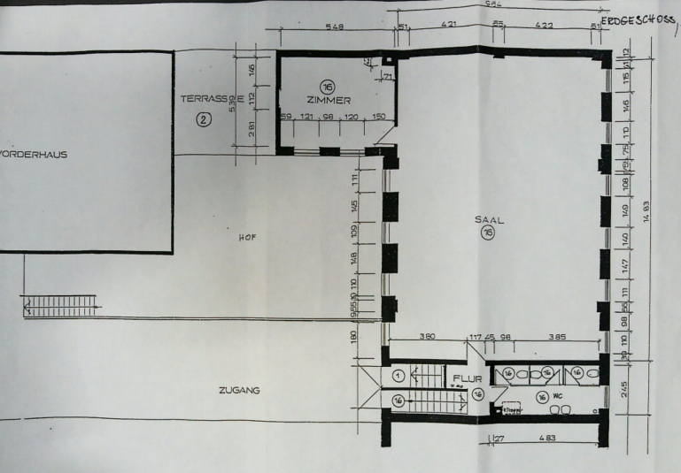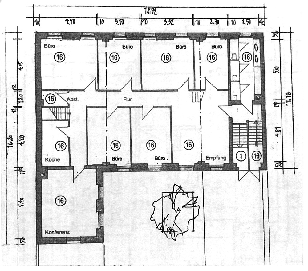 Sie erreichen die derzeitige Büroetage bzw. künftige Wohnetage über eine Treppe ins Hochparterre, die zur Wohneinheit gehört. Aktuell befinden sich sieben Zimmer sowie eine großzügige Diele auf dieser Etage, ein Waschraum und ein weiterer Raum mit Anschlüssen für Küche und teilweise für Bad sowie ein Flur und eine Abstellkammer. In der Abstellkammer befindet sich der Schaltraum für alle mit LAN verkabelten Räume, also sieben Zimmer und die Diele.