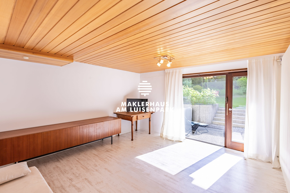 Im Gartengeschoss befindet sich ein charmantes Kaminzimmer mit direktem Gartenzugang sowie ein separates Zweizimmer-Appartement mit Küchenzeile und Duschbad. Diese Einheit kann auf Wunsch abgetrennt und eigenständig genutzt werden.