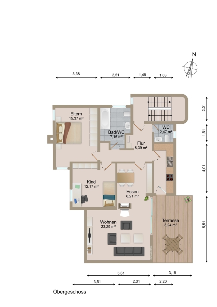Die zweite Wohneinheit im 1. Obergeschoss umfasst ca. 86 m² Wohnfläche mit dreieinhalb Zimmern und einer sonnigen Südostterrasse (ca. 13 m²). Im Jahr 2023 wurde sie umfassend modernisiert – mit geölten Eichenholzdielen und einer hochwertigen, modernen Einbauküche.