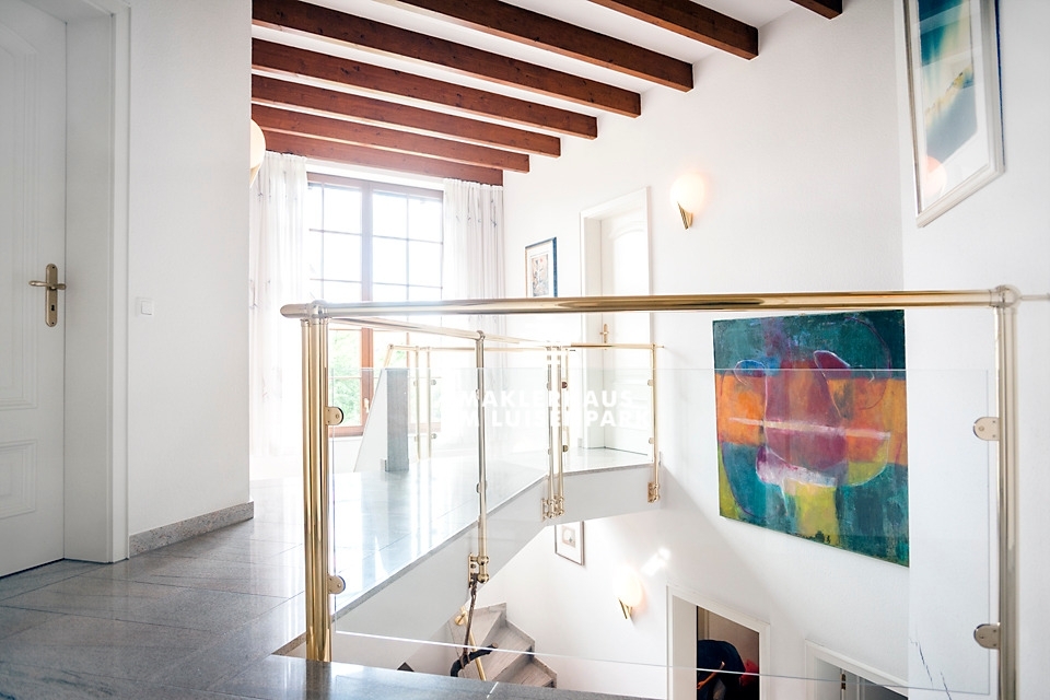 Das besondere Wohnkonzept wird abgerundet durch Holzsprossenfenster mit gelben Sandsteinbänken, Schleiflacktürelementen, einem hochwertigen Kachelofen und einer lichtdurchfluteten Galerie, die den Mittelpunkt des Hauses darstellt.