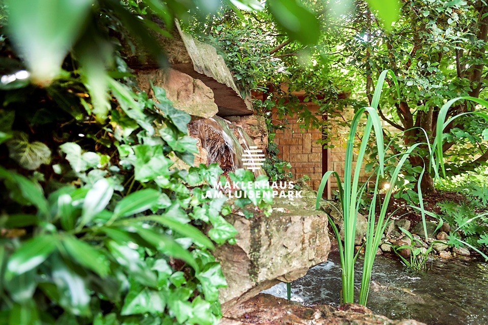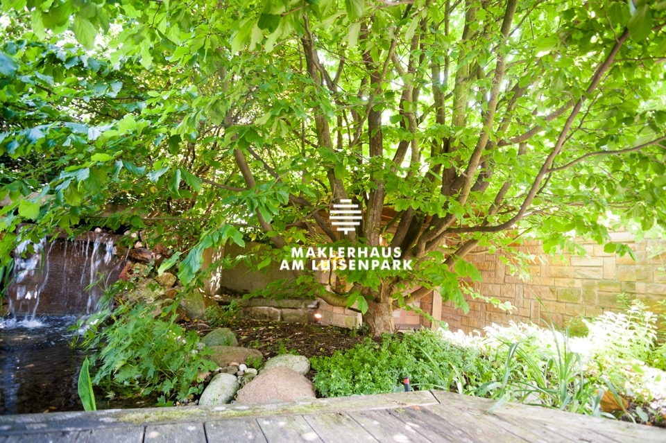 Der Garten als Komposition aus Steinen, Wasserspielen und veredelten Ziersträuchern, Zierbäumen und Stauden, vollendet das in sich sehr harmonisch gestaltete Refugium.