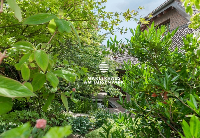 Der Garten als Komposition aus Steinen, Wasserspielen und veredelten Ziersträuchern, Zierbäumen und Stauden, vollendet das in sich sehr harmonisch gestaltete Refugium.