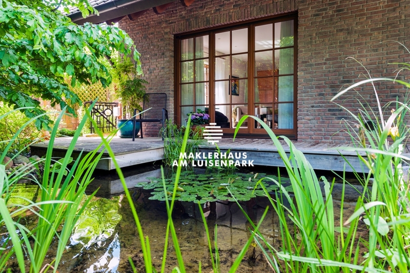 Das Anwesen bietet ein sehr komfortables Wohnhaus, eingebettet in ein individuell angelegtes und jahreszeitlich arrangiertes Gartengrundstück mit Bachlauf, Teich und Wasserfall.